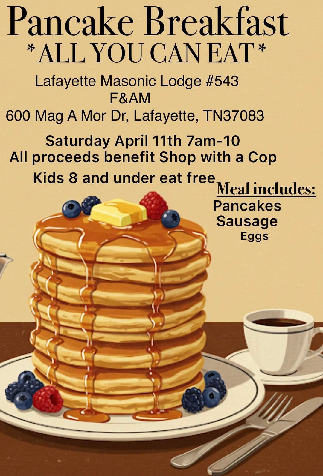 Lafayette #543 - Pancake Breakfast 7 AM to 10 AM. Kids 8 and under eat free. Proceeds to benefit Shop With A Cop