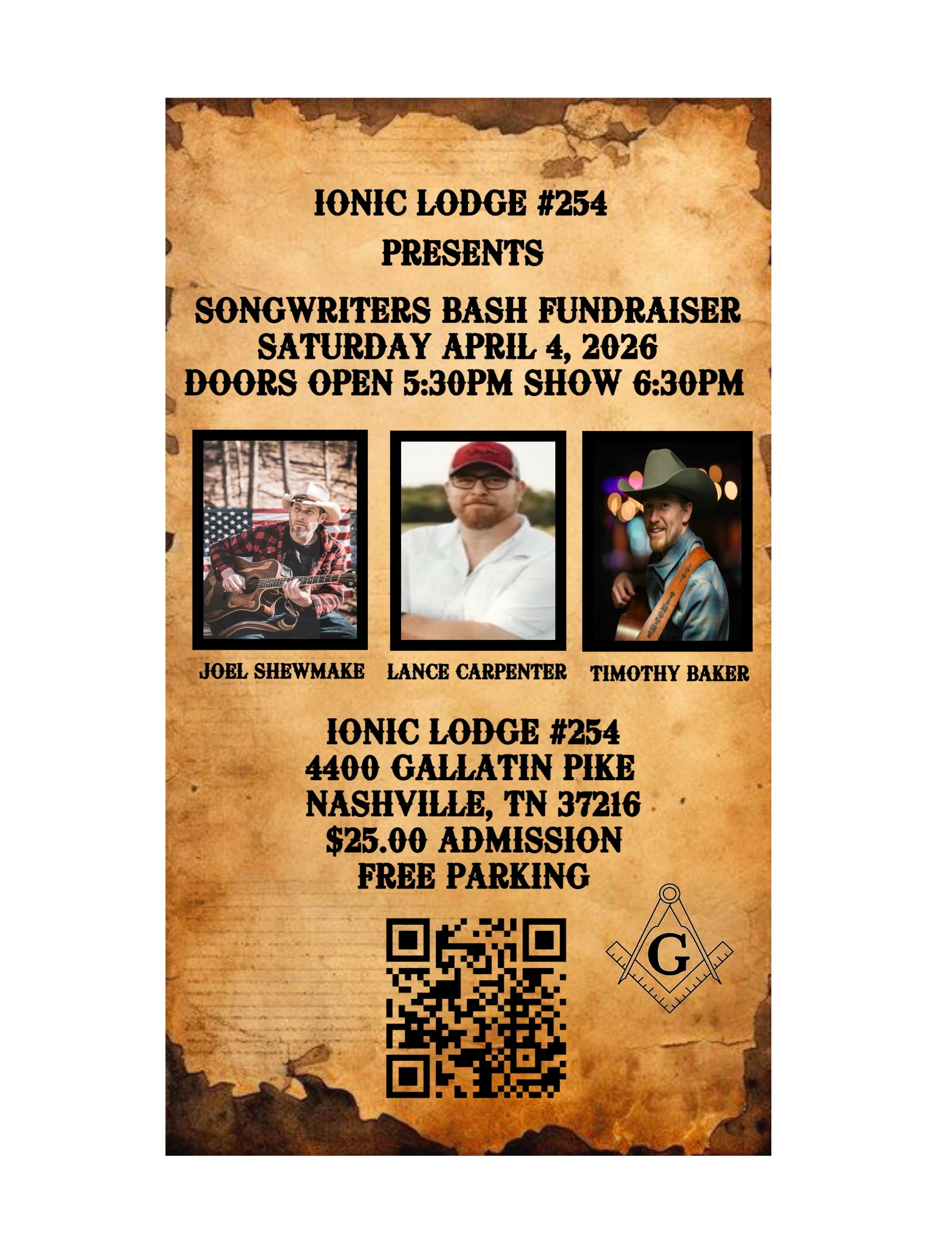 Ionic #254 - Songwriters Bash Fundraiser - Doors open 5:30 PM with show to start at 6:30 PM. Free parking. $25 admission